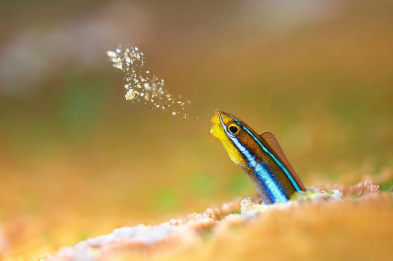 This image is a split second in time that accomplishes exactly what great photography should: it tells a story. It is far more powerful than a standard blenny portrait, and I particularly enjoy the natural background created by the wide-open aperture—a choice that makes an already difficult shot even harder to execute. I also love the way the soft background colors beautifully complement the blue of the fish.